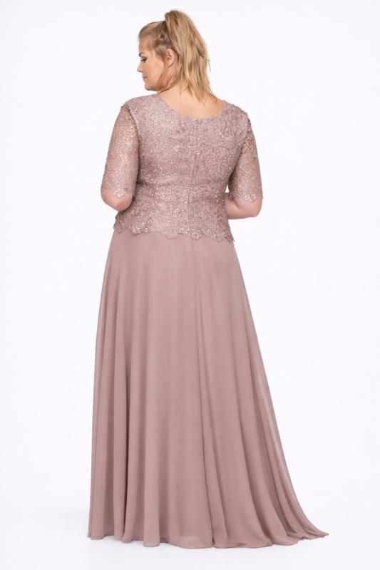 Avondjurk grote maat met korte mouwen en elegant V-decolleté, luxe kant en wijde rok.