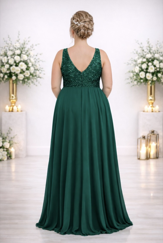 Deze elegante galajurk in grote maat heeft een verfijnde en tijdloze uitstraling.
