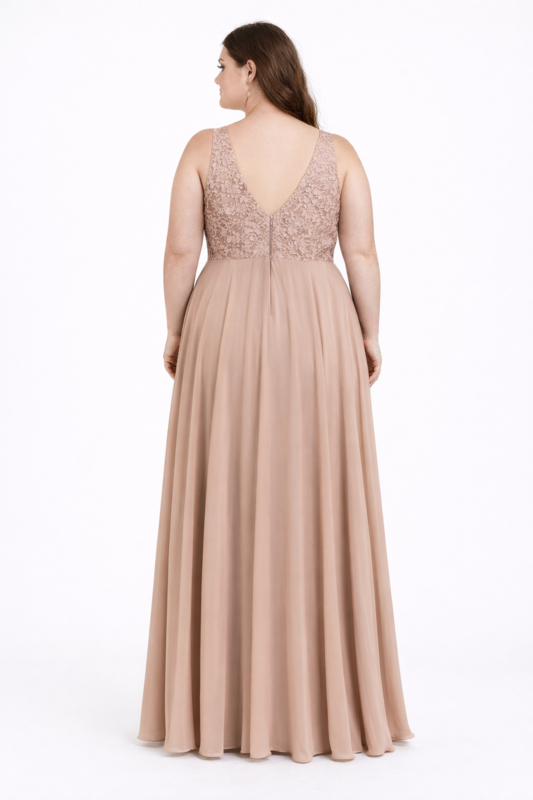 Met een diepe V-halslijn en brede schouderbanden biedt deze plus size galajurk een vrouwelijke en comfortabele pasvorm.