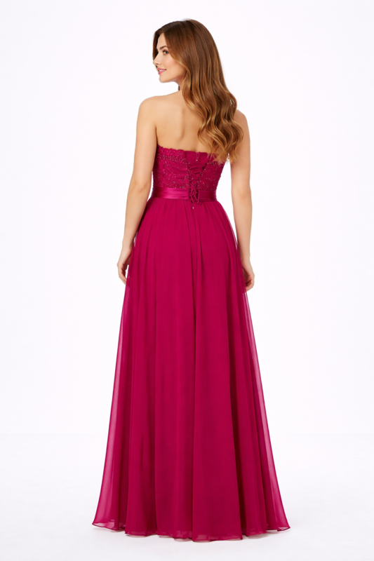 Stijlvolle fuchsia kleur galajurk met een elegante strapless halslijn en luxe bewerkte top met parels en tule.