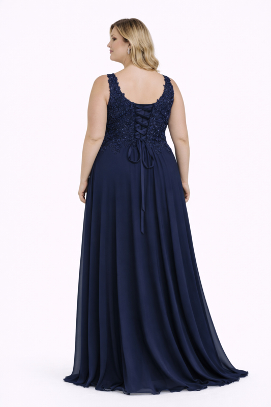 Deze elegante galajurk in grote maten heeft brede schouderbanden en voorgevormde cups die een perfecte ondersteuning bieden.