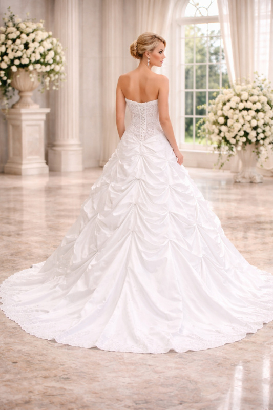 Deze prachtige witte satijnen Sissi trouwjurk is perfect voor de bruid die droomt van een echte prinsessenlook.
