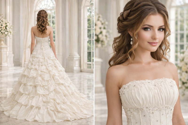Deze bruidsjurk met ruffles en corset is verkrijgbaar in maat 36, 38 en 40 en ideaal voor een romantische en elegante bridal look.