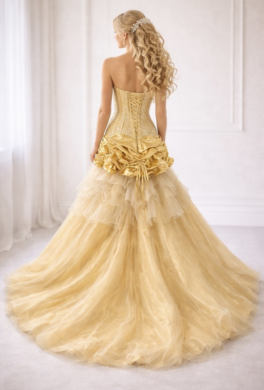 Sissi trouwjurk goud strapless corset tule rok.