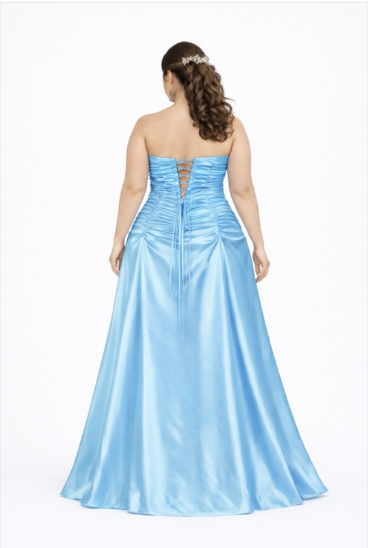Turquoise galajurk – strapless met vetersluiting en tule voering