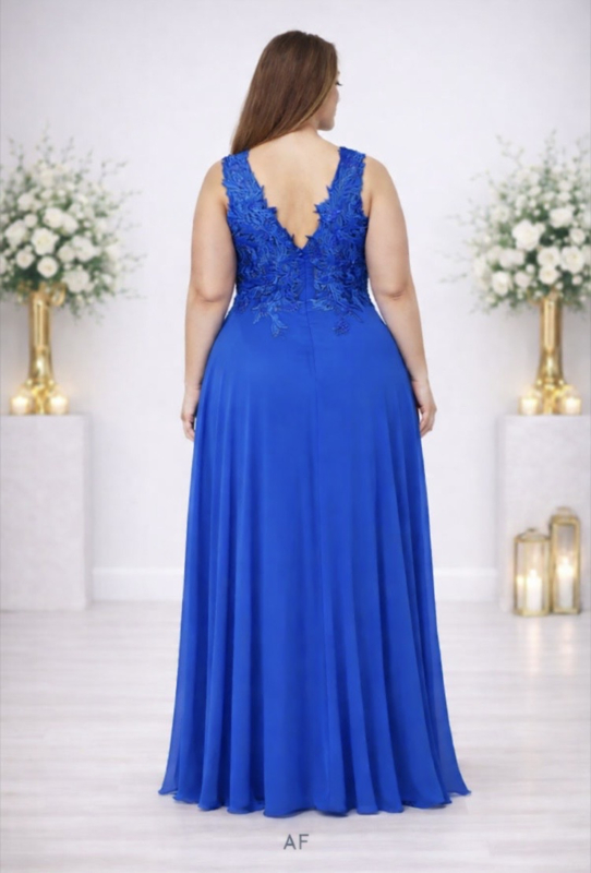 Koningsblauwe galajurk in grote maten – luxe kant, V-hals en flatterende pasvorm.