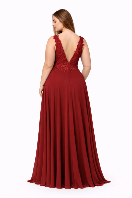 Plus size galajurk met diepe V-halslijn, brede schouderbanden en hoge split.