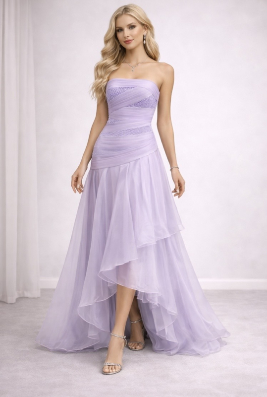 Galajurk – strapless, high-low model met kralen en strokenrok.