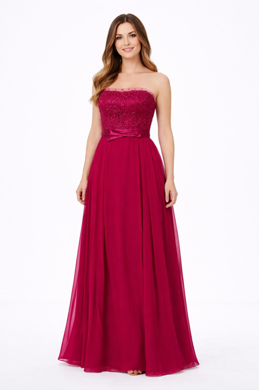 Stijlvolle fuchsia kleur galajurk met een elegante strapless halslijn en luxe bewerkte top met parels en tule.