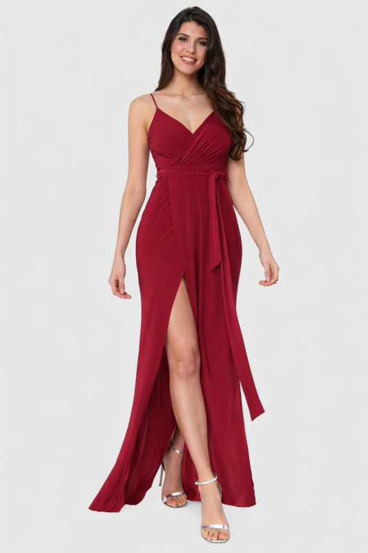 Deze elegante bordeaux galajurk met spaghettibandjes heeft een flatterend wikkelmodel dat…€ 39,95