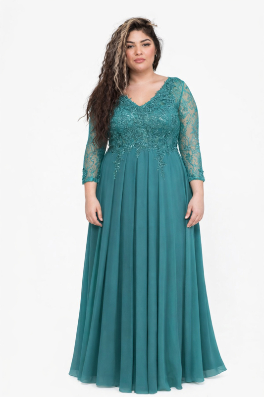 Adembenemende galajurk plus size met V-decolleté en lange mouwen voor grote maten.
