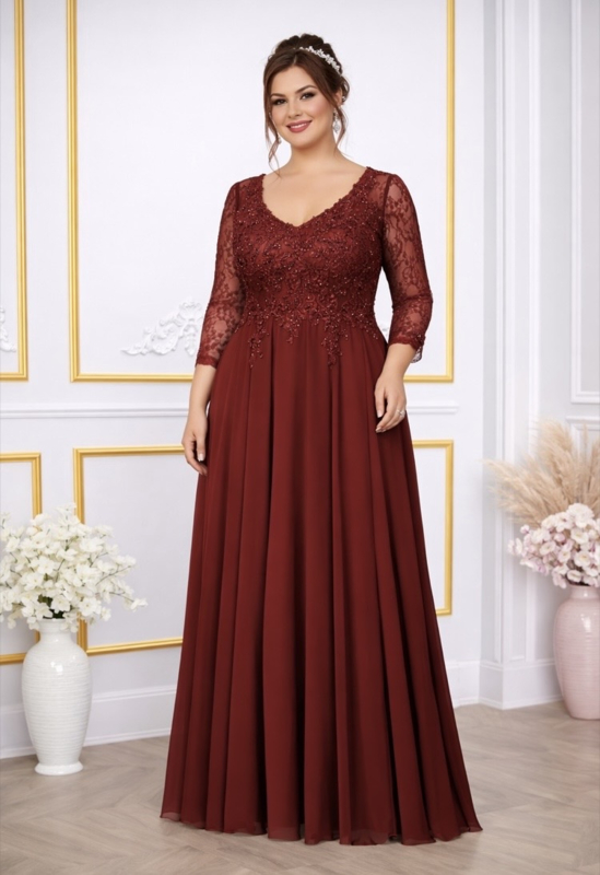 lange mouwen galajurk grote maat 44 t/m 60Galajurk bordeaux is op voorraad.