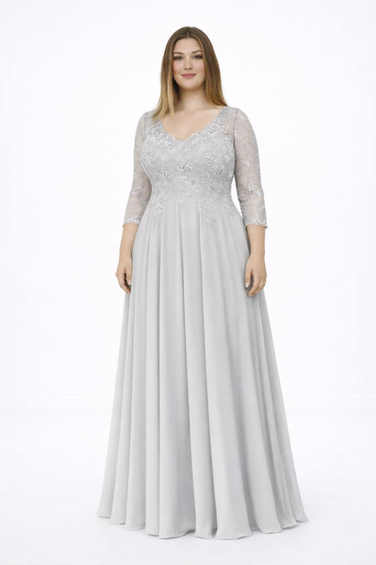 lange mouwen galajurk grote maat 46 t/m 50Galajurk zilver is op voorraad.