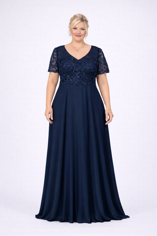 marineblauwe grote maat galajurk 50, 52Marineblauwe galajurk is op voorraad.