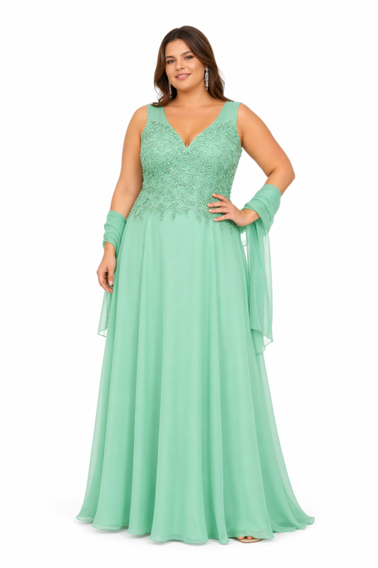 mintgroene grote maat galajurk 46, 48, 50Mintgroene galajurk is op voorraad.