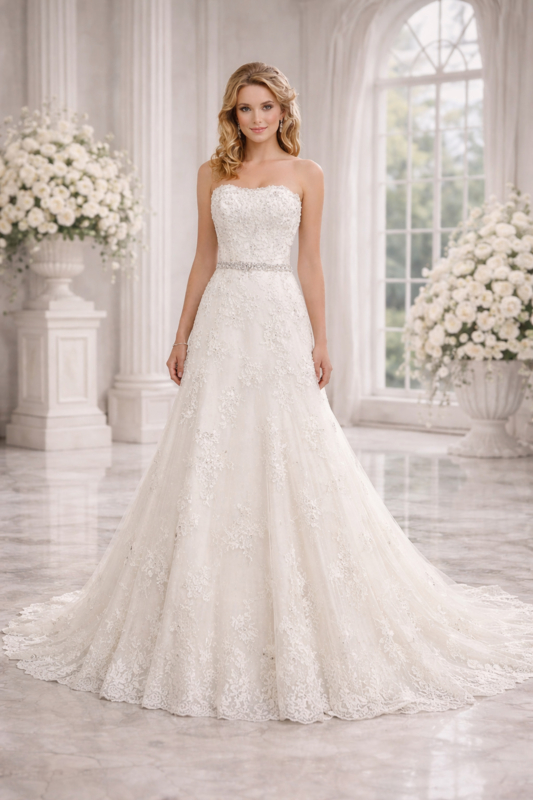 A-lijn trouwjurk ivoor strapless kant maat 34-38Deze trouwjurk is op voorraad en direct leverbaar bij Aryan Fashion.
