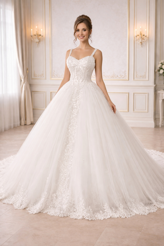 Deze prinsessen trouwjurk in A-lijn model combineert luxe en elegantie.