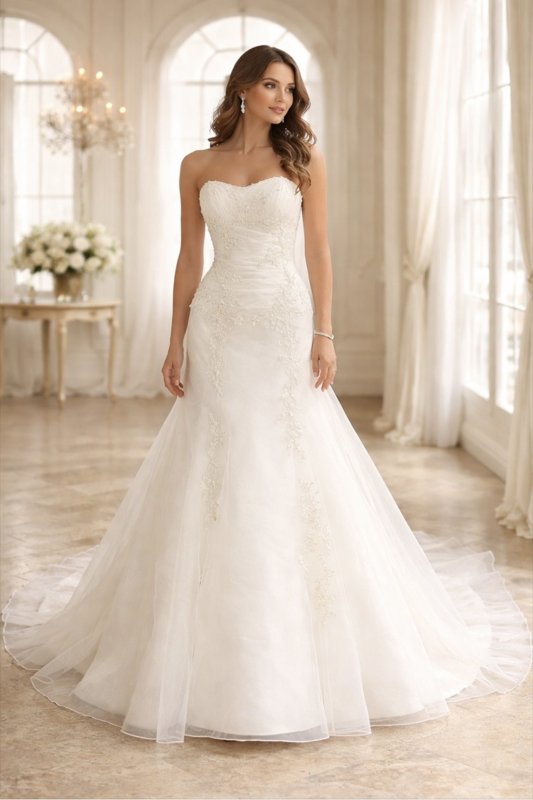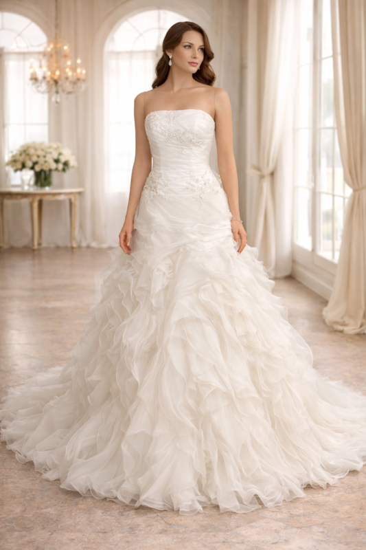 A lijn trouwjurk maaat 32, 34, 36Deze A-lijn trouwjurk met strapless lijfje is op voorraad en direct leverbaar bij Aryan Fashion.