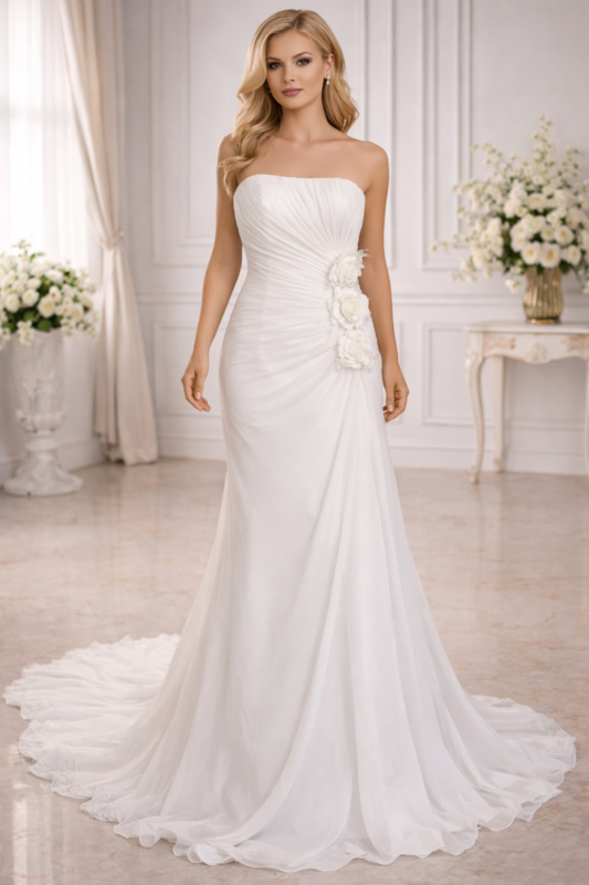 Deze chiffon trouwjurk met strapless lijfje is op voorraad en direct leverbaar bij Aryan Fashion.