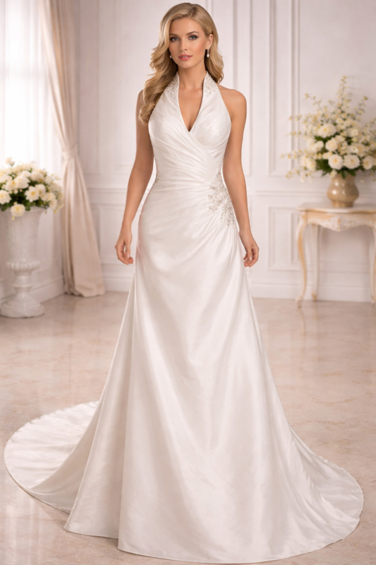 Deze aansluitende trouwjurk met halter halslijn is op voorraad en direct leverbaar bij Aryan Fashion.