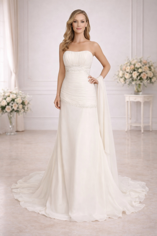 chiffon trouwjurk ivoor strapless maat 34-38Deze chiffon trouwjurk ivoor maat 34-38 met strapless lijfje en soepel vallende rok is op voorraad en direct leverbaar bij Aryan Fashion.