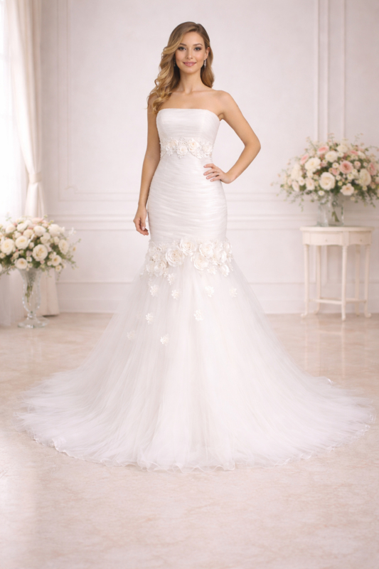 chiffon trouwjurk ivoor strapless aansluitend maat 34-38Deze chiffon trouwjurk ivoor maat 34-38 met strapless lijfje en aansluitend model met tule onderrok is op voorraad en direct leverbaar bij Aryan Fashion.