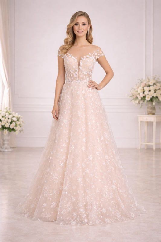 trouwjurk blush ivoor tweekleurig A-lijn maat 34-38Deze tweekleurige trouwjurk blush ivoor maat 34-38 met transparant lijfje en A-lijn rok is op voorraad en direct leverbaar bij Aryan Fashion.