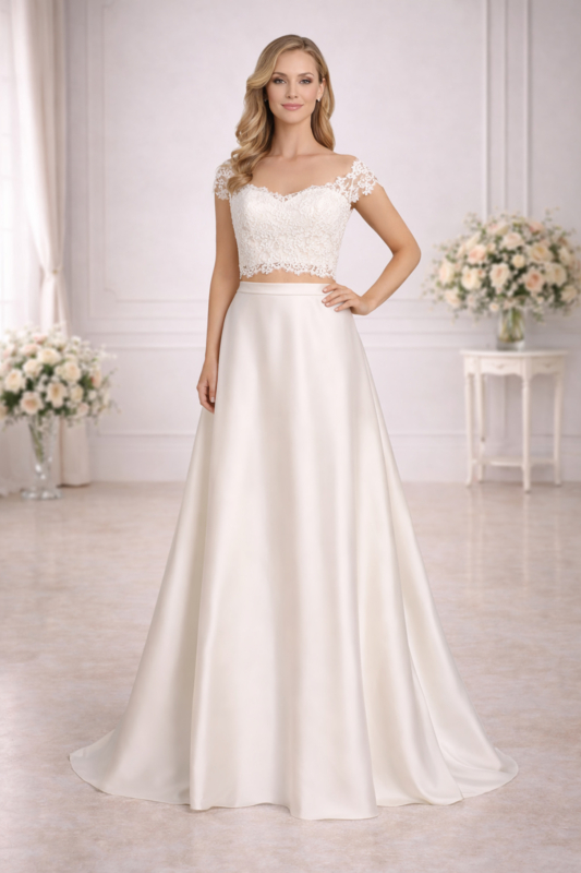 tweedelige trouwjurk ivoor satijn met kanten top maat 34-38Deze tweedelige trouwjurk ivoor maat 34-38 met kanten top en satijnen rok is op voorraad en direct leverbaar bij Aryan Fashion.