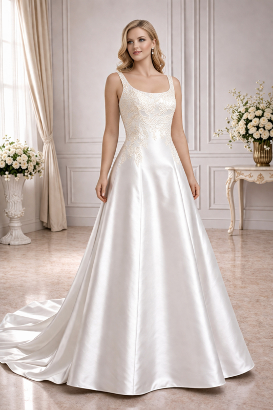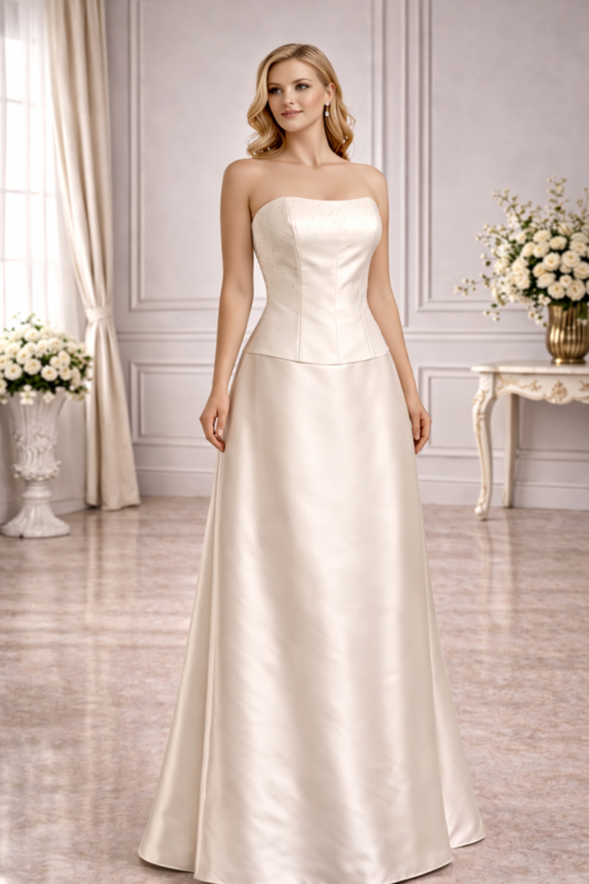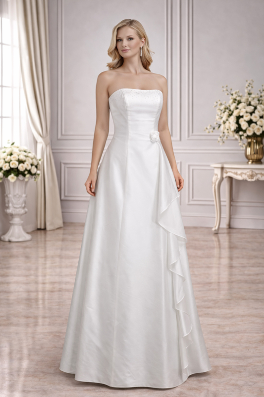 trouwjurk ivoor satijn strapless maat 34-38 Bianco EventoDeze bruidssatijn trouwjurk ivoor maat 34-38 met strapless lijfje en minimalistisch A-lijn model is op voorraad en direct leverbaar bij Aryan Fashion.