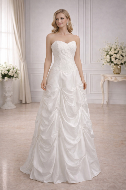 rouwjurk ivoor taffeta strapless A-lijn maat 34-38Deze ivoor taffeta trouwjurk maat 34-38 met strapless halslijn en elegante A-lijn pasvorm is perfect voor de bruid die houdt van een rustige, stijlvolle uitstraling. De gladde stof en subtiele ruches aan de zijkant geven de jurk…
