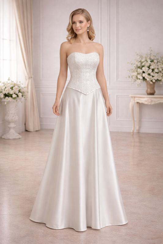 trouwjurk ivoor satijn met kanten corset maat 34-38Deze bruidssatijn trouwjurk ivoor maat 34-38 met strapless kanten corset en soepel vallende satijnen rok heeft een elegante en tijdloze uitstraling. De combinatie van een verfijnd kanten lijfje en een gladde rok zorgt voor een…