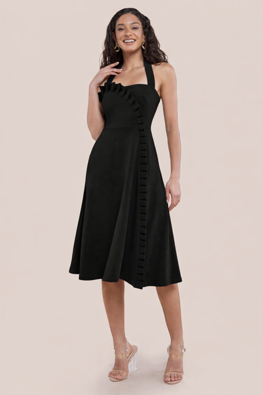 Deze cocktailjurk heeft een halterband die in de nek wordt…